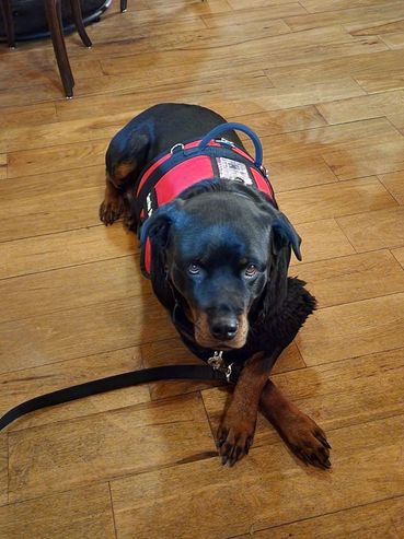 June helps calm me down by decompression licking, deep pressure therapy and by watching my six. I was helping my kids with an orchestra event and June alerted me to my anxiety because she led me (made me) leave the room and took me to a quiet place away from others until she knew I was calm and ready to go back. I have never liked going out in public by myself but with June, she makes it a little easier each day.
